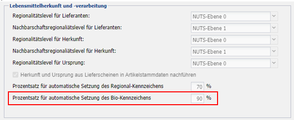 Die Berechnung des Bio-Anteils von Speisen erfolgt, wie weiter unten beschrieben automatisch. Abhängig von einem definierten Prozentsatz wird bei der Speise das Kennzeichen "bio" automatisch gesetzt. Dieser Prozentsatz kann hier hinterlegt werden.