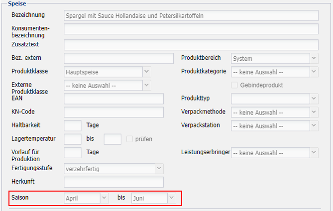 Gleiches wie für die Einkaufsprodukte gilt für Speisen. Auch hier obliegt es deshalb dem Anwender, ein Gericht für einen bestimmten Zeitraum als saisonal einzustufen.