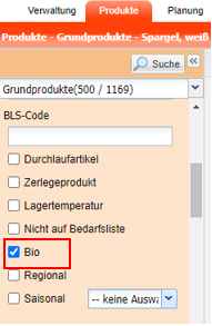 In der Produktsuche steht die Optionen „bio“ und "saisonal" zur Verfügung.\ Für Einkaufsprodukte gibt es nur eine „Wahr“-Suche, d.h. ist die Suchoption „bio“ gesetzt, werden alle Einkaufsprodukte mit der Eigenschaft „bio“ gefunden, ist die Option nicht gesetzt, werden alle Einkaufsprodukte (bio und nicht bio) gefunden.