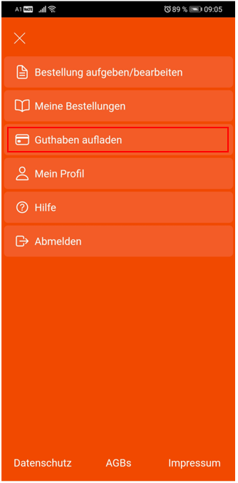 Bei Kunden mit dieser Einstellung wird in der mynecta-Bestell-APP ein zusätzlicher Menüpunkt Guthaben aufladen aktiviert.