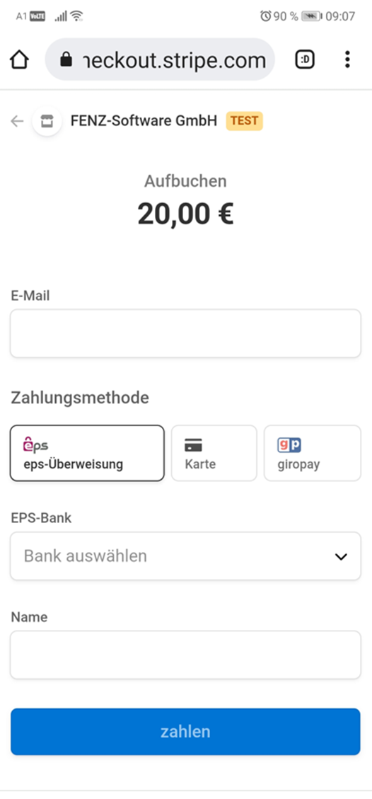 Über den Button Guthaben aufladen verbindet sich die mynecta-Bestell-APP zu Stripe, wo die Transaktion unter Auswahl der von Ihnen freigegebenen Zahlungsarten abgewickelt werden kann.