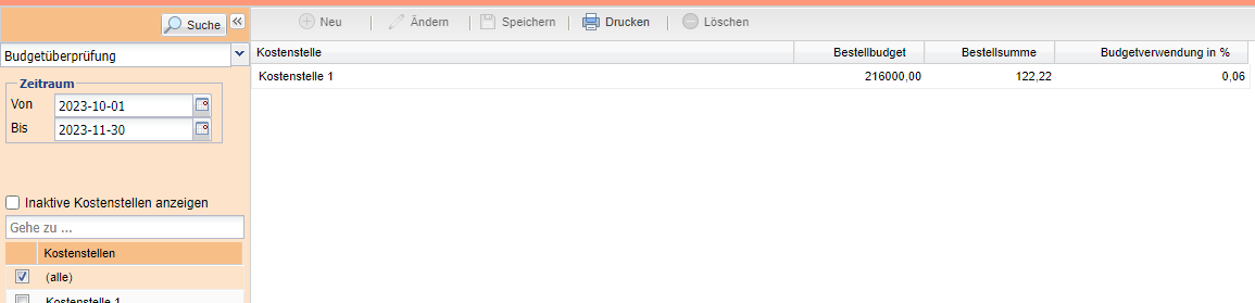 Zeitraum Auswahl eines Berichtszeitraums. Das Bestellbudget, welches in der Kostenstelle hinterlegt wurde, wird anhand des ausgewählten Zeitraums berechnet.