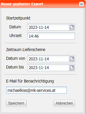 Bei der Neuanlage (nach Auswahl des gewünschten Exports) müssen Startzeitpunkt und Zeitraum der Lieferscheine ausgewählt, als auch (mindestens) eine E-Mailadresse zum Erhalt der Benachrichtigung hinterlegt werden.