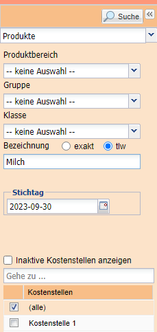 | Inaktive Kostenstellen anzeigen | Durch Setzen des Schalters werden auch Lagerbestände von inaktiven Kostenstellen angezeigt. |