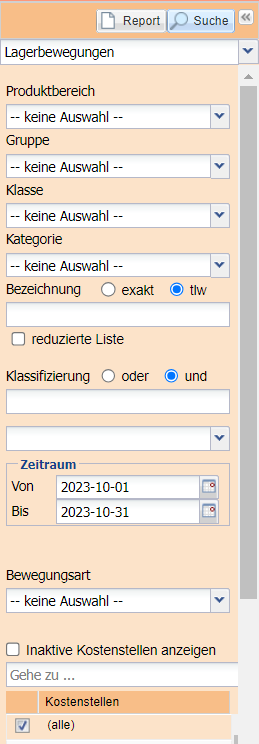| Zeitraum | Auswahl des Zeitraums über welchen die Lagerbewegungen ermittelt werden sollen. |