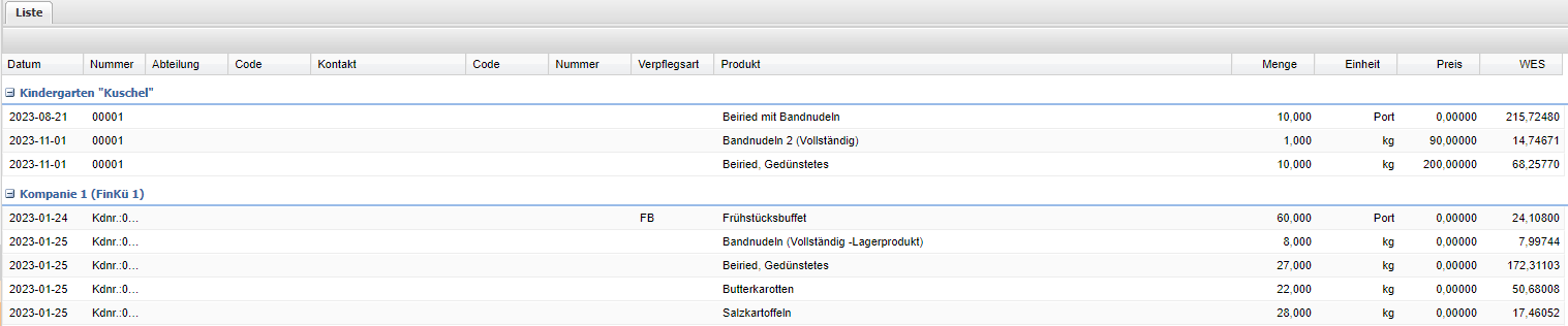 Anzeige des Wareneinsatzes laut Rezeptur. |