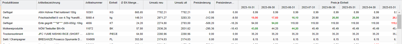 | Preisänderung % | Anzeige der Preisdifferenz zwischen Umsatz alt und Umsatz neu in %. |
