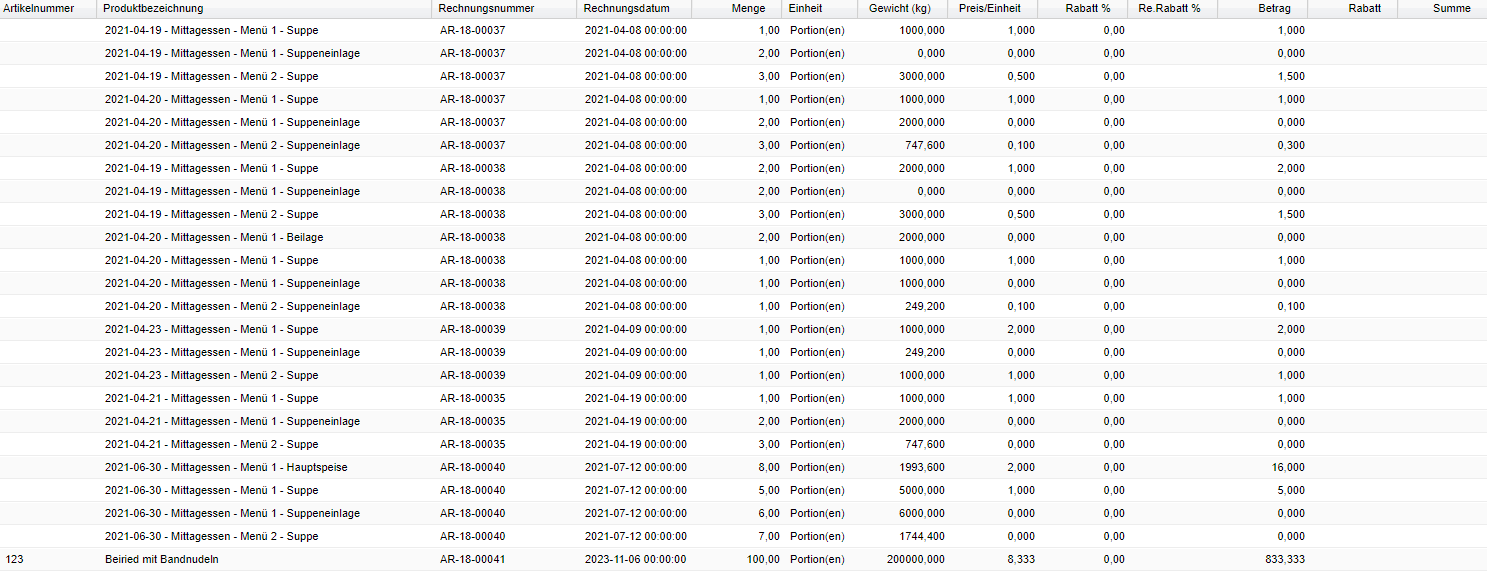 Anzeige der im Wochenmenüplan bei der Verpflegsart bzw. beim Verkaufsprodukt in der Verkaufsliste hinterlegten Artikelnummer. |
