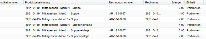| Summe nach Produkt | Wenn dieselben Produkte mehrmals in der Liste angezeigt werden, werden diese kumuliert und als Gruppenkopf fett geschrieben dargestellt. |