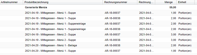 | Summe nach Produktgruppe | Summierung der Produkte nach Produktgruppen. Dargestellt werden diese fett geschrieben im Gruppenkopf. Produktgruppen sind z.B. Generierte Menüs (alle Produkte, welche über Wochenmenüpläne verkauft wurden), sowie die Produktklassen, der Produkte, welche über Verkaufslisten verkauft wurden. |