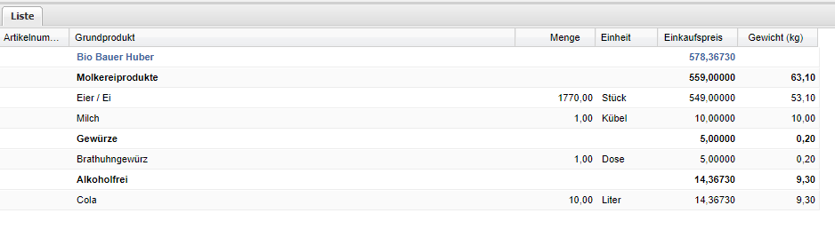 | Gewicht (kg) | Anzeige des Gewichts insofern eine Relation zu Kilogramm oder Liter vorhanden ist. |