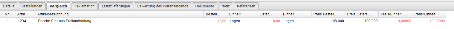 Durch Betätigen de Buttons werden Mengen und Preise von Bestellung und Lieferschein gegenübergestellt.