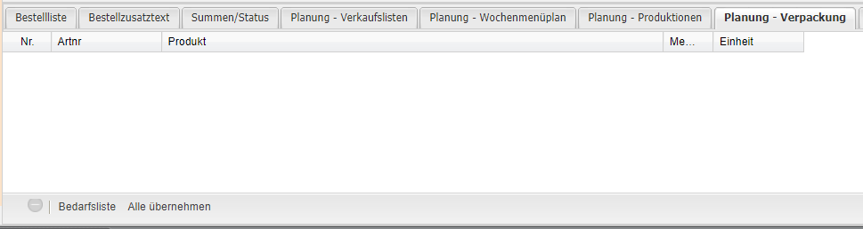An dieser Stelle kann auf Basis von Verpackungen eine Bedarfsliste für die Bestellung erstellt werden.