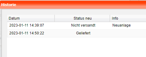 | Historie | Durch Betätigen des Buttons wird ein neues Fenster geöffnet, in welchem die Historie je Bestellreferenz ersichtlich ist. |