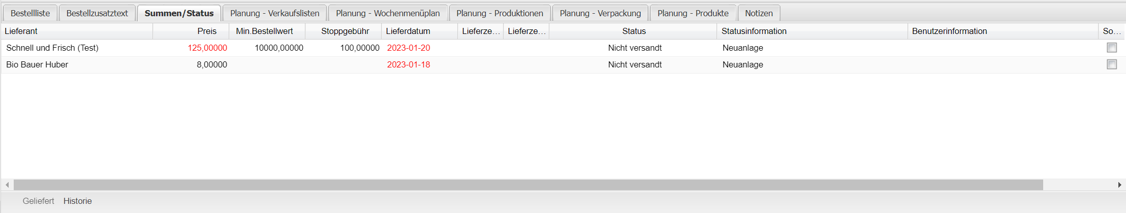 | Lieferant | Anzeige aller Lieferanten, welche Lieferantenartikel in der Bestellung verknüpft haben. Ein Lieferant kann mehrmals vorkommen, insofern mehrere Liefertage in der Bestellung vorkommen. |