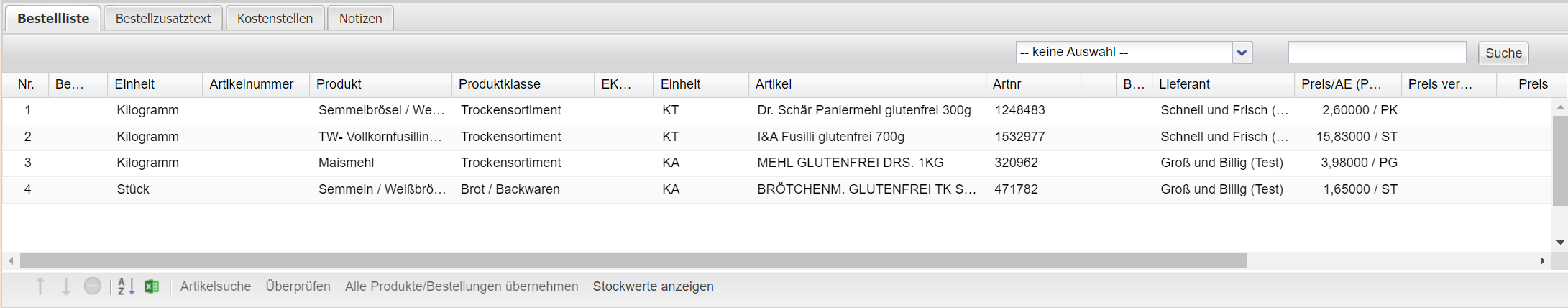 Suche In der Mitte des Bildschirms an der rechten Seite kann man innerhalb der Bestellliste nach Produktklassen filtern bzw. nach einzelnen Produkten suchen.