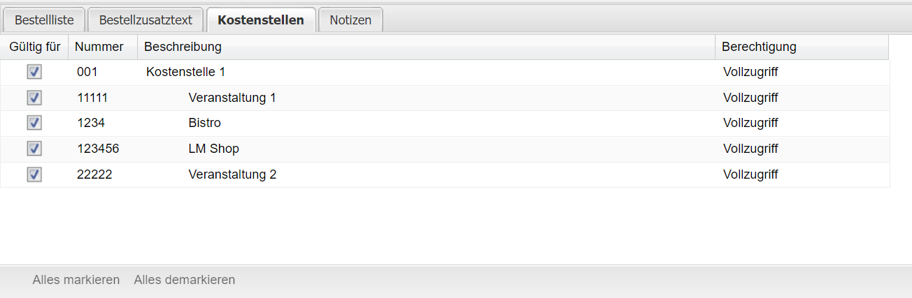 - Verwendung (Kostenstelle darf die Musterbestellung verwenden, aber nicht verändern oder löschen.