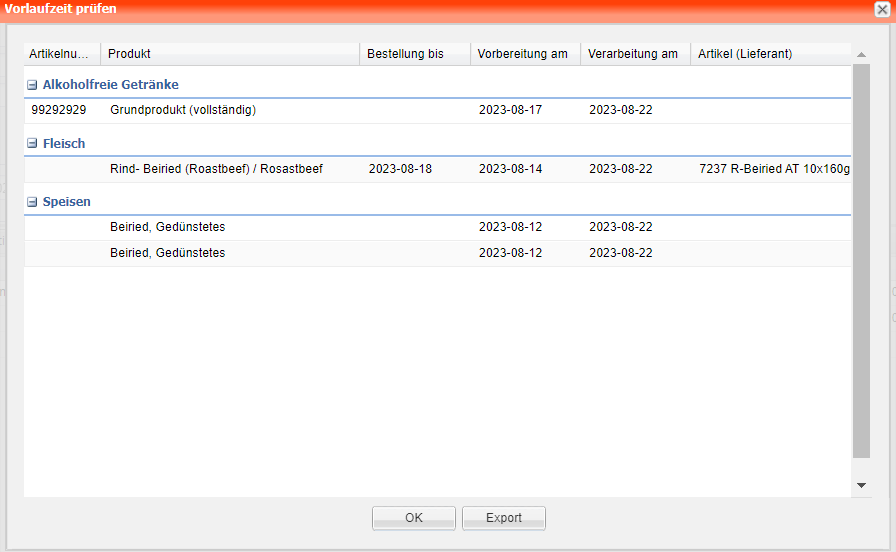 Durch Betätigen des Buttons öffnet sich ein weiteres Fenster und es werden sämtliche Produkte mit hinterlegter Vorlaufzeit angezeigt und können exportiert werden.