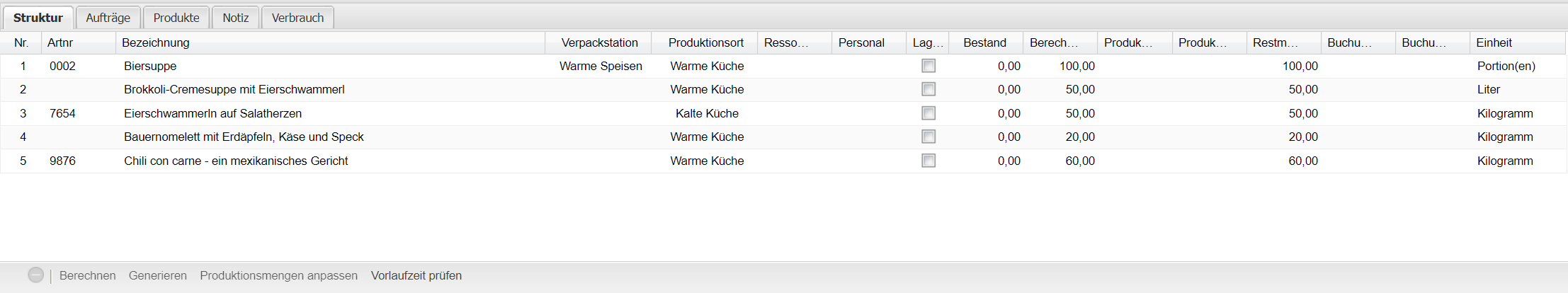 Produktionsmengen anpassen Durch Betätigen des Buttons werden sämtliche Produktionsmengen neu berechnet. Produktionsmenge = Berechnete Menge - Bestand. Ist der Bestand größer als die berechnete Produktionsmenge dann wird auch keine Produktionsmenge berechnet.