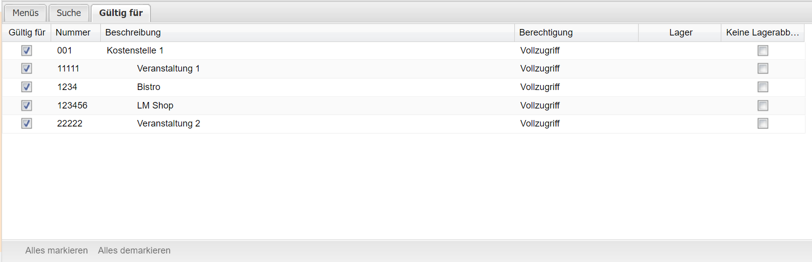 | Gültig für | Durch Setzen des Schalters ist der Tagesmenüplan für diese Kostenstelle gültig. |