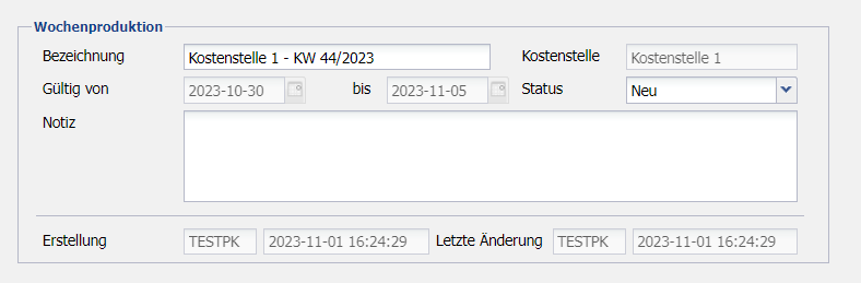 Bezeichnung Übernehmen der automatisch generierten Wochenproduktionsbezeichnung bzw. Hinterlegen einer eigenen Bezeichnung.