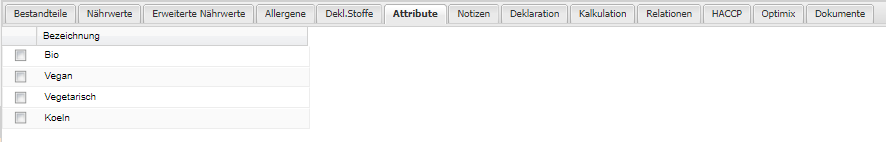 Diverse Attribute Durch Setzen des Schalters wird dem Grundprodukt das dynamische Attribut zugeordnet. Im Grundprodukt müssen diese manuell hinterlegt werden. In den Speisen, Getränken bzw. Non-Food Artikeln können diese gegebenenfalls aus den Grundprodukten berechnet werden. Die Berechnungslogiken von Attributen findet man unter Verwaltung - Produktdaten -Attribute