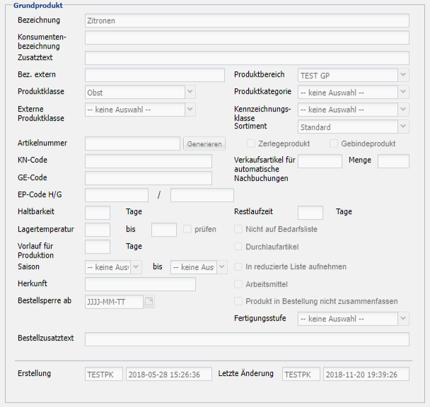 Produktklasse Produktklassifizierung, wie z.B. Fleisch, Fisch, Obst, Gemüse, usw. Hier kann die entsprechende Produktklasse ausgewählt werden. Die Produkte können bei der Suche zu einem späteren Zeitpunkt über die Filterung auf Produktklasse schneller gefunden werden.
