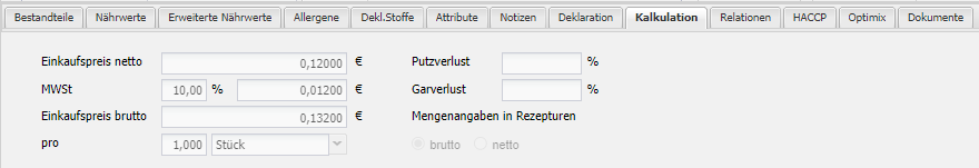 brutto: Ist bei Mengenangaben in Grundprodukten „brutto“ eingestellt, wird der Putzverlust in Prozent nur für die Nährwerte errechnet.