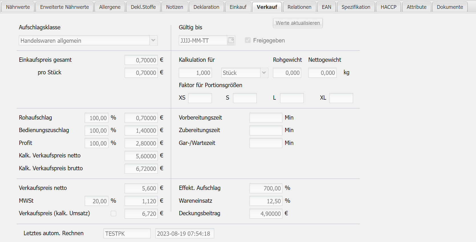 Kalk. Verkaufspreis nettoBerechneter Netto-Verkaufspreis über WES + Aufschläge. (Verkaufspreis netto = Einkaufspreis + Rohaufschlag + Bedienungszuschlag + Profit)