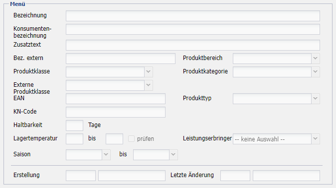 Produktklasse Produktklassifizierung, wie z.B. Fleisch, Fisch, Obst, Gemüse, usw. Hier kann die entsprechende Produktklasse ausgewählt werden. Die Produkte können bei der Suche zu einem späteren Zeitpunkt über die Filterung auf Produktklasse schneller gefunden werden.