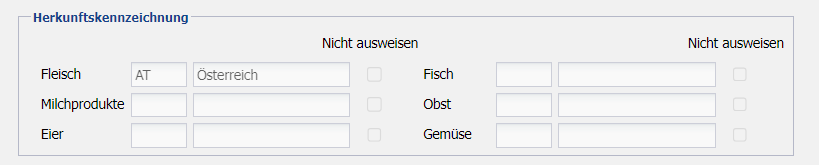 | Herkunft | Hinterlegen des Herkunftsortes. Diese Info wird im Etikettendruck berücksichtigt. Info: Herkunft => z.B.: Pute aus Ungarn (weil großgezogen) Ursprungsland => Pute in Österreich verarbeitet => Ö Ursprungsland. |