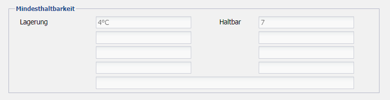 | Lagerung | Hinterlegen der verschiedenen Lagerungsmöglichkeiten und der daraus resultierenden Haltbarkeit