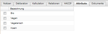 | Diverse Attribute | Durch Setzen des Schalters wird dem Grundprodukt das dynamische Attribut zugeordnet. Im Grundprodukt müssen diese manuell hinterlegt werden. In den Speisen, Getränken bzw. Non-Food Artikeln können diese gegebenenfalls aus den Grundprodukten berechnet werden. Die Berechnungslogiken von Attributen findet man unter Verwaltung - Produktdaten -Attribute |
