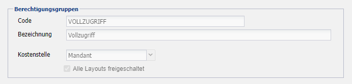Kostenstelle Auswahl einer Kostenstelle, oder des gesamten Mandanten. Je nach Auswahl kann diese Berechtigungsgruppe dann nur für Bearbeiter in einer Kostenstelle ausgewählt werden, oder bei allen Bearbeitern.