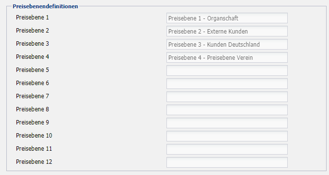 Hier können die für Verkäufe standardmäßig zur Verfügung stehenden zwölf Preisebenen, mit einer eigenen Bezeichnung belegt werden. Diese wird auf allen Kostenstellen des Mandanten an den relevanten Stellen angezeigt.
