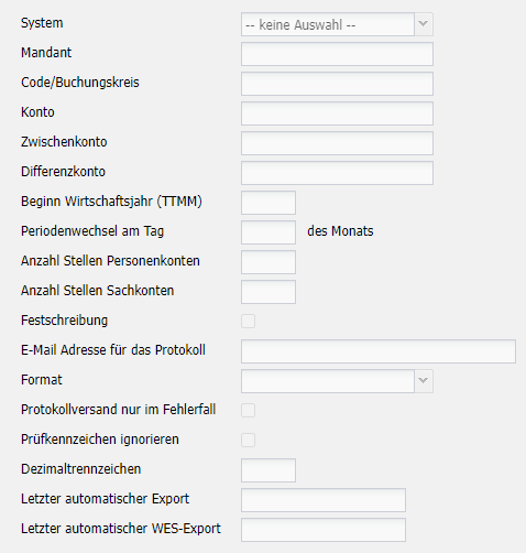 Abhängig von der ausgewählten Buchhaltungsschinttstelle müssen andere Daten hinterlegt bzw. Felder befüllt werden. Das Einrichten der Buchhaltungsschnittstelle erfolgt im Normalfall durch einen necta-Techniker.