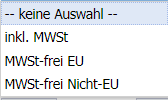 | Verrechnung | Legt die grundsätzliche Mehrwertsteuerverrechnungsart für den Kunden fest. Bei Verrechnung „inkl. MWSt“ wird bei Erstellung eines Auftrags oder einer Rechnung der jeweils hinterlegte MWSt-Satz aus der Produktklasse übernommen. Bei „MWSt-frei EU“ und „MWSt-frei Nicht-EU“ wird jede Verrechnung mehrwertsteuerfrei vorgenommen. Die Unterscheidung zwischen EU und Nicht-EU wirkt sich lediglich beim Rechnungsdruck aus. |