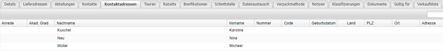 Anzeige sämtlicher Adressen und Geburtsdaten je Kontakt