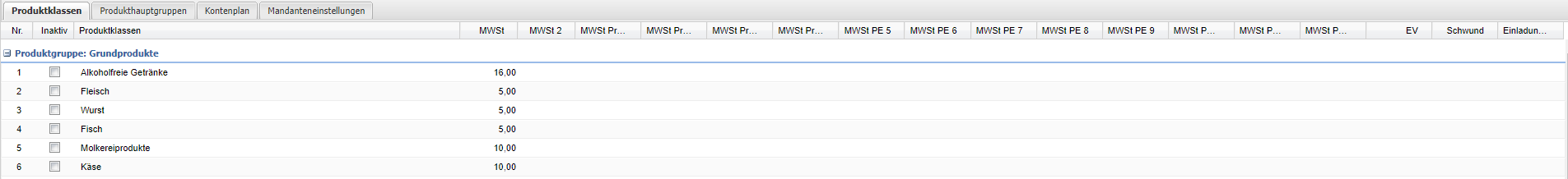 Bei allen Produktgruppen, welche dem Verkauf über Menüvorbestellung oder Verkaufslisten dienen, müssen die Spalten MWSt PE 1 - MWSt PE 12 (PE = Preisebene) befüllt werden. Diese Spalten beziehen sich immer auf die Debitoren und müssen bei folgenden Produktgruppen befüllt werden: