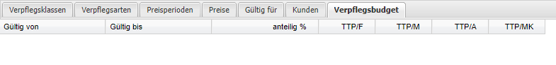 | Budget je Verpflegsklasse | Als Basis für die gesamte Berechnung des WES BKT sowie der Anzahl der BKT, dient das innerhalb der Menüplanklasse hinterlegte Verpflegsbudget je Verpflegsklasse. |