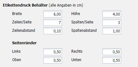 Hinterlegen der Maße der Etiketten in cm.