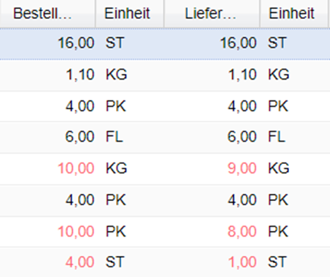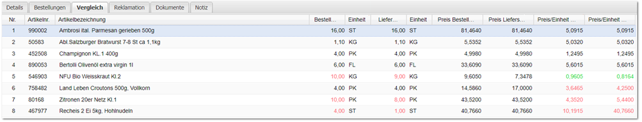 Bei Unterschieden von Bestellpreisen und Lieferpreisen werden diese rot bzw. wenn es zum Vorteil des Kundens ist grün markiert.