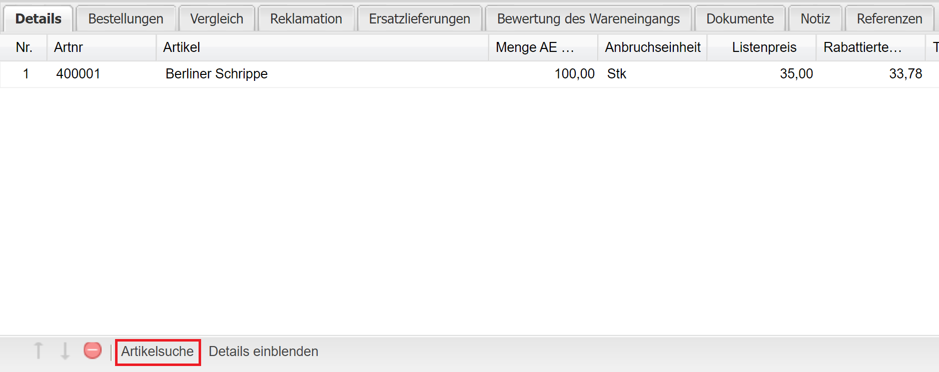 Zuerst müssen Sie den Einkaufsartikel im oberen Bereich per Mausklick markieren. Dadurch färbt sich die Zeile blau:
