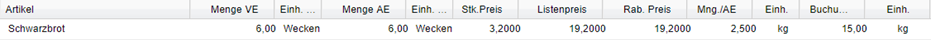 Hier wird 6,00 (Wecken) x 2,500 (kg) = 15,00 kg errechnet. Somit werden 15,00 kg Schwarzbrot auf das Lager gebucht.