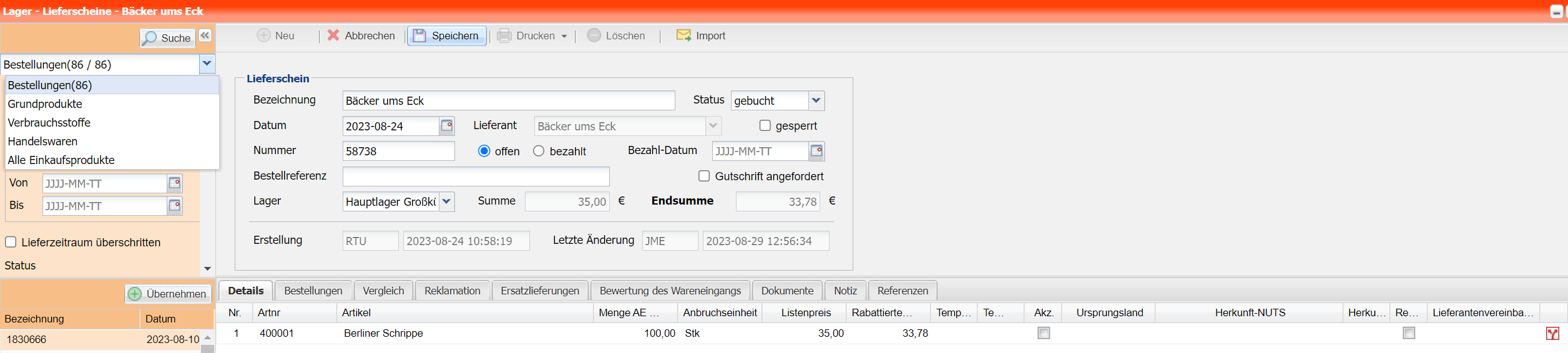 Per Doppelklick auf die gesuchte Bestellung wird diese dem Lieferschein hinzugefügt.