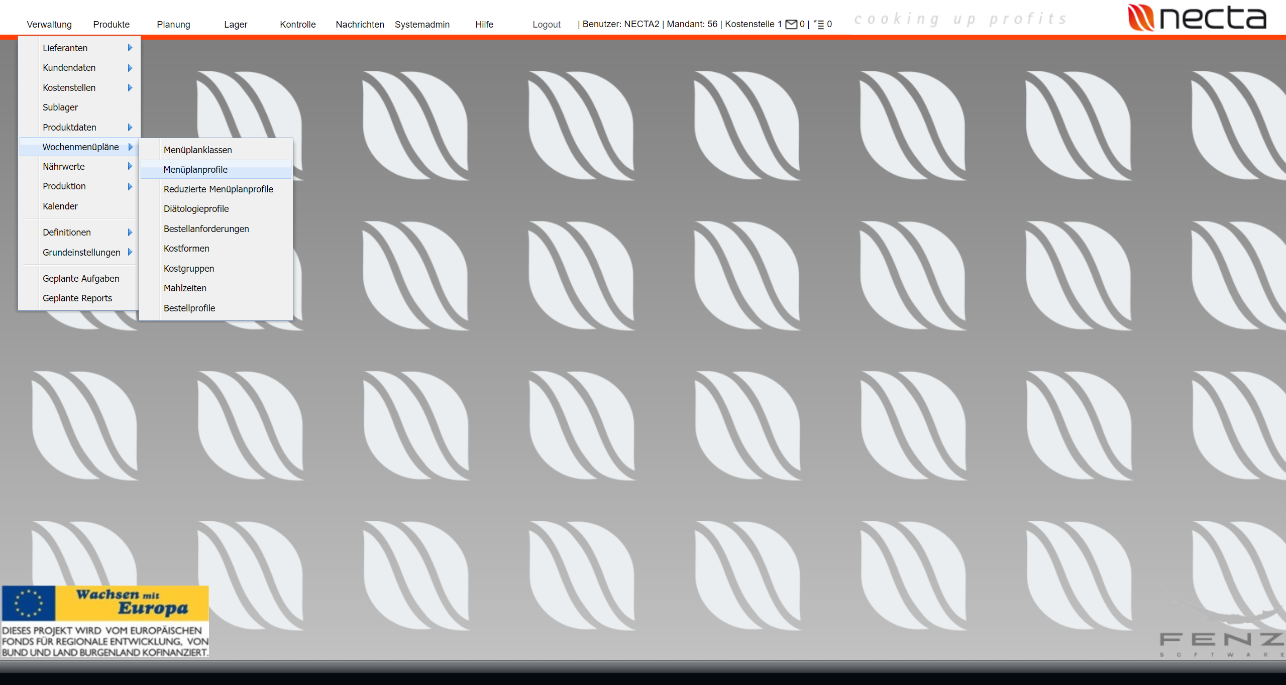 Unter dem Menüpunkt "Verwaltung" und den Unterpunkten "Wochenmenüpläne" sowie "Menüplanprofile" kann man ein neues Menüplanprofil erstellen.