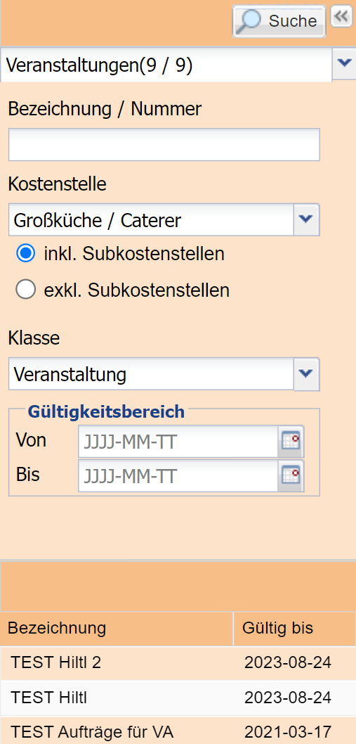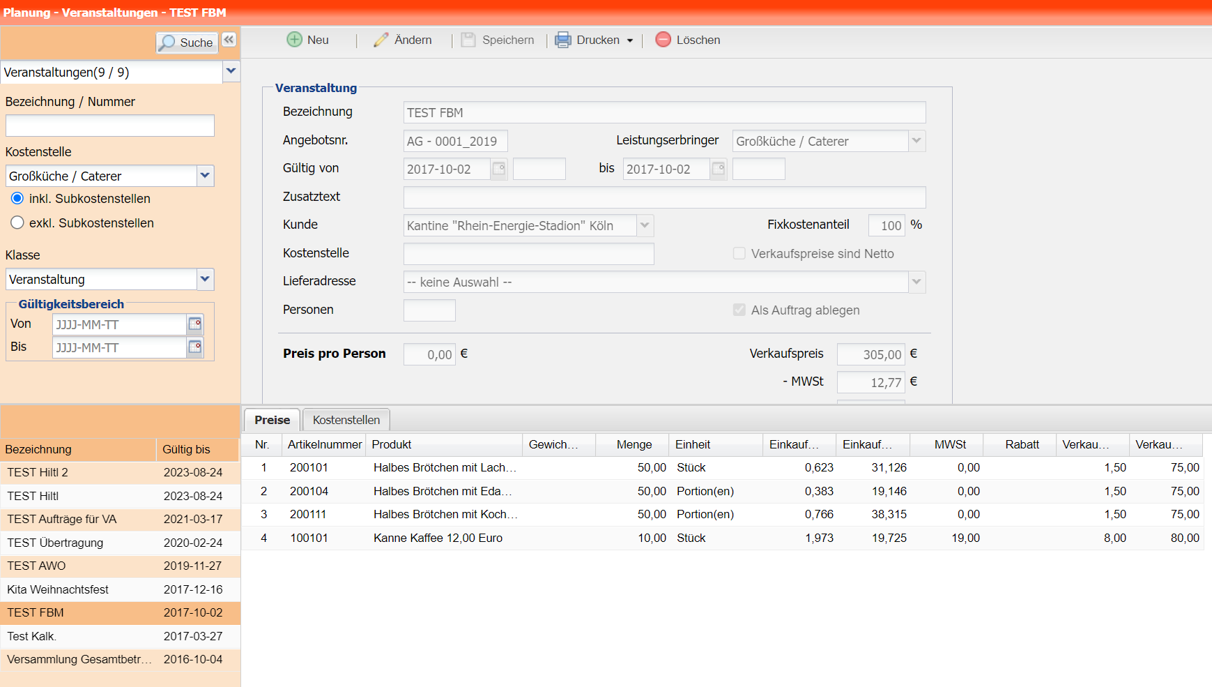Veranstaltungen dienen dazu, für außergewöhnliche Bestellungen, Events, usw. Kalkulationen zu erstellen, bzw. einen Auftrag zu erzeugen, mit dem in necta weitergearbeitet werden kann.