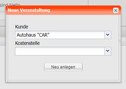 Im ersten Schritt wählt man aus, für welchen Kunden, bzw. welche Kostenstelle die Veranstaltung erstellt werden soll.