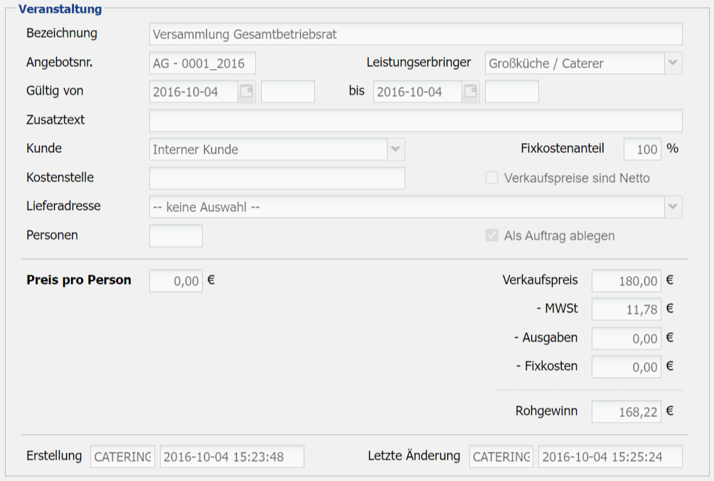 Nach dem Abspeichern der Veranstaltung errechnet sich die Kalkulation.