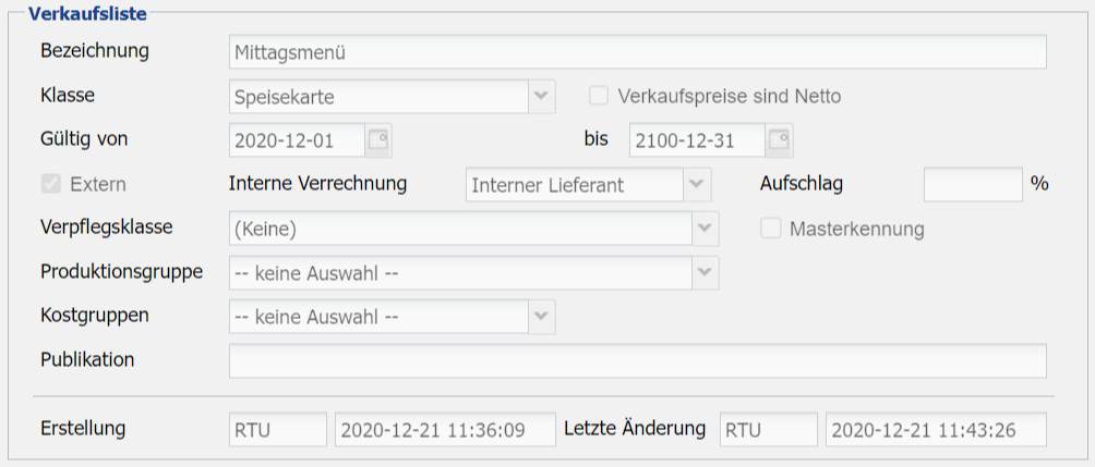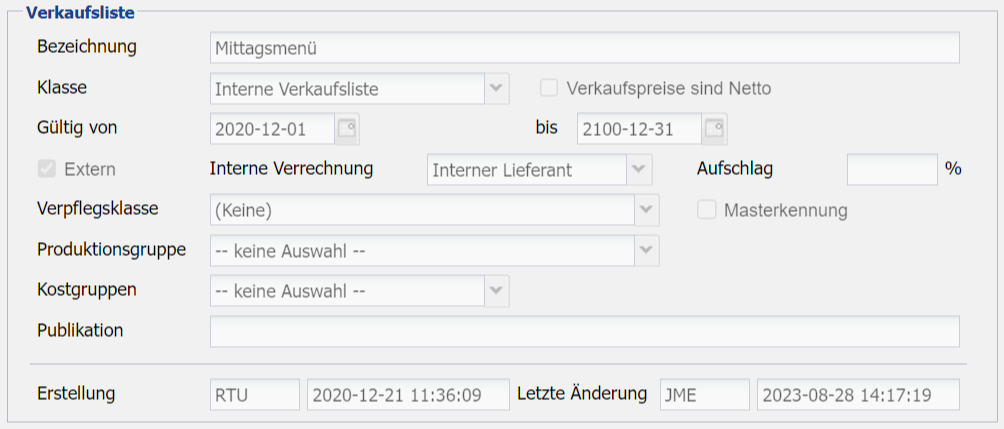 Nach dem Erstellen und Befüllen der Verkaufsliste müssen folgende Einstellungen getroffen werden, um eine interne Verkaufsliste zu erstellen: